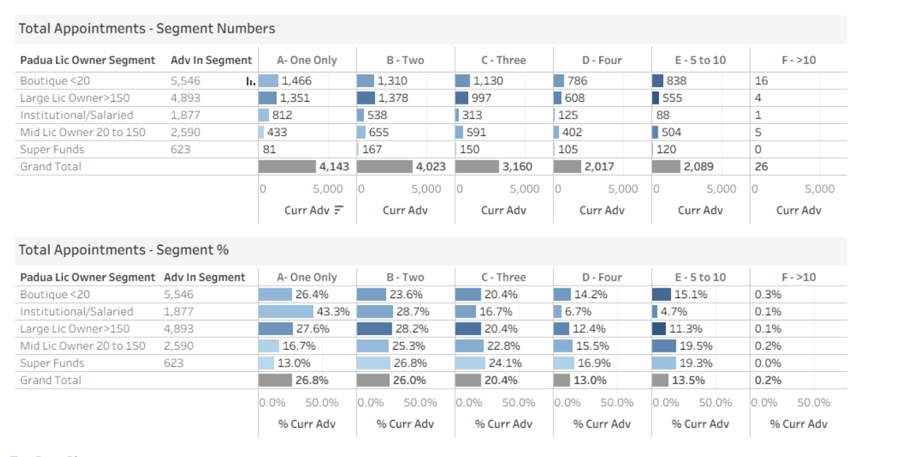 The largest share of the ‘Padua Lic Owner Segment’ (see below for breakup), for one appointment is the Institutional / Salaried sector, with 43.3% of their advisers appointed only once. Next is the Large Lic Owner with over 150 advisers at 27.6%. The smallest is Super Funds at 13.0%.